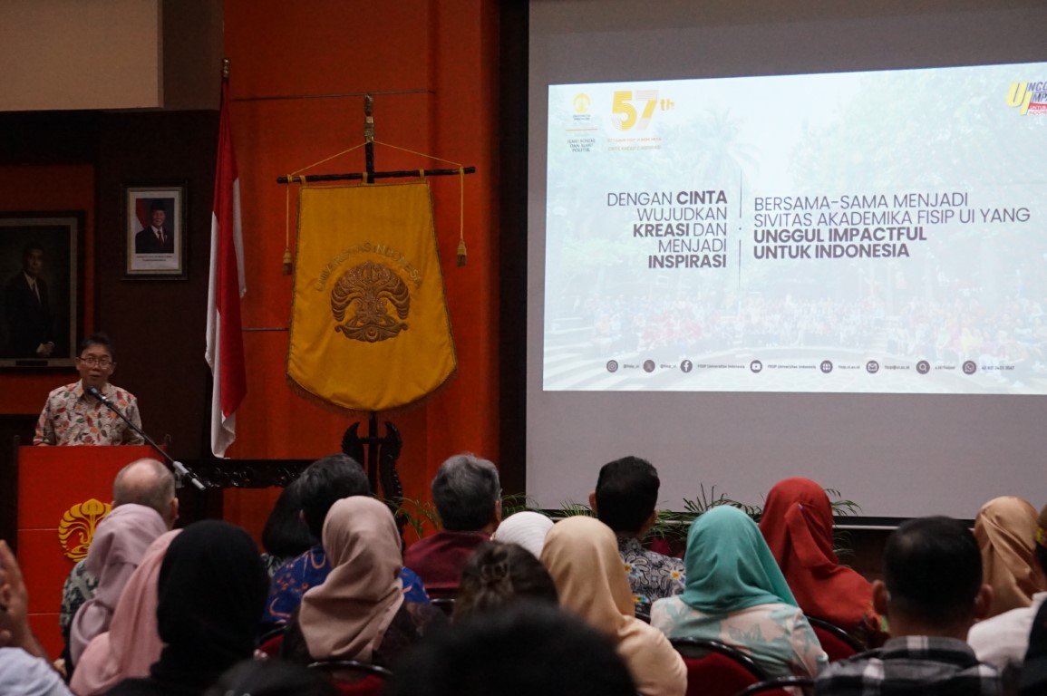 Dalam sambutannya, Dekan FISIP UI, Prof. Dr. Semiarto Aji Purwanto mengatakan bahwa perjalanan panjang selama 57 tahun telah menjadikan FISIP UI sebagai pusat unggulan dalam kajian ilmu sosial dan politik serta sebagai Momentum untuk merefleksikan pencapaian, tantangan, serta arah masa depan FISIP UI. Komitmen FISIP UI dalam terus berkembang dan memberikan kontribusi nyata bagi masyarakat, bangsa, dan negara.