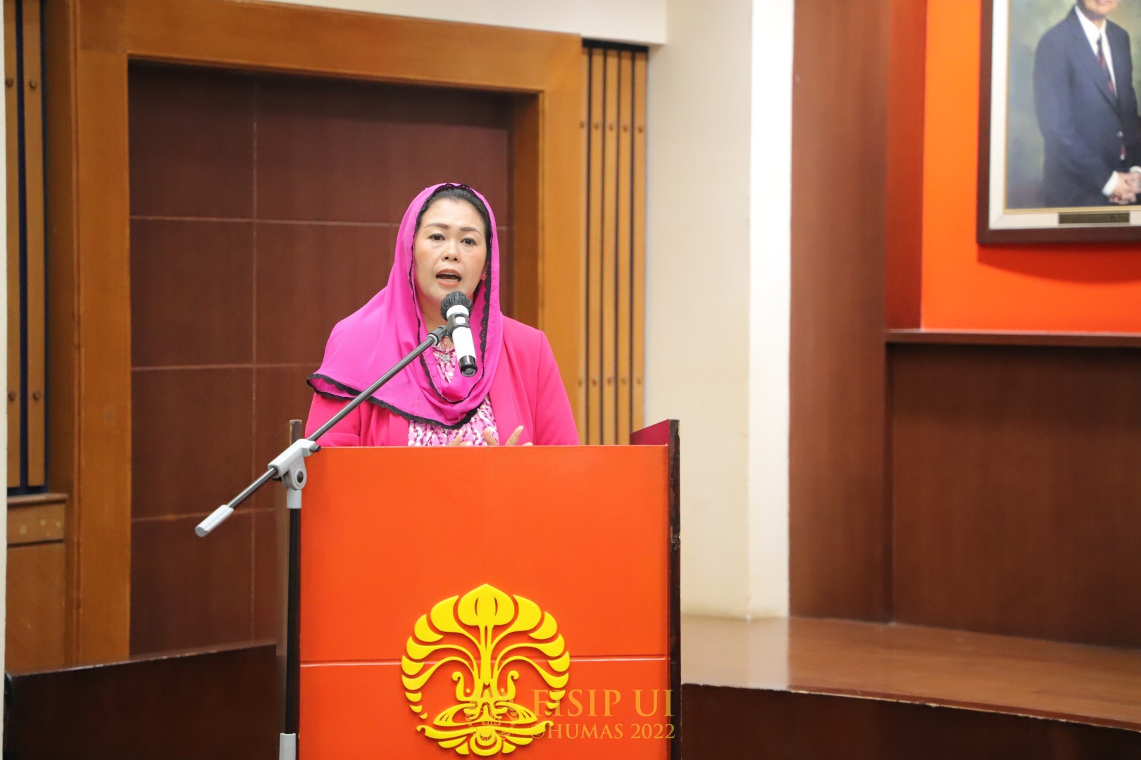 Yenny Wahid, menyerukan kepada para mahasiswa untuk menjadi kekuatan perubahan. “Saat ini, kita menghadapi tiga tantangan global: teknologi, ekologi, dan ideologi,” tuturnya di depan sivitas akademika FISIP UI yang menghadapi kegiatan tersebut.