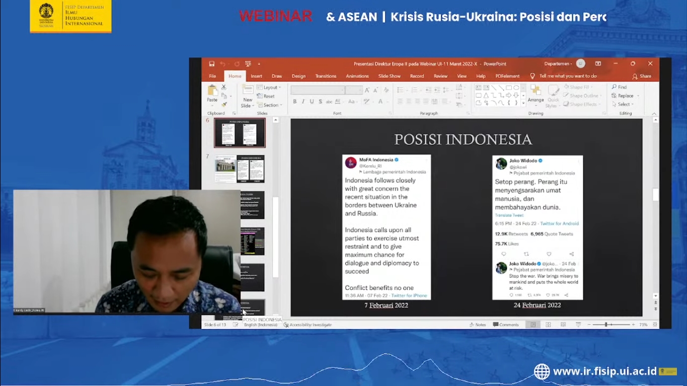 Departemen Hubungan Internasional FISIP UI dan Center for International Relations Studies LPPSP FISIP UI menyelenggarakan kegiatan webinar Krisis Rusia-Ukraina: Posisi dan Peran Indonesia & ASEAN pada Jumat (11/03) live on Zoom.