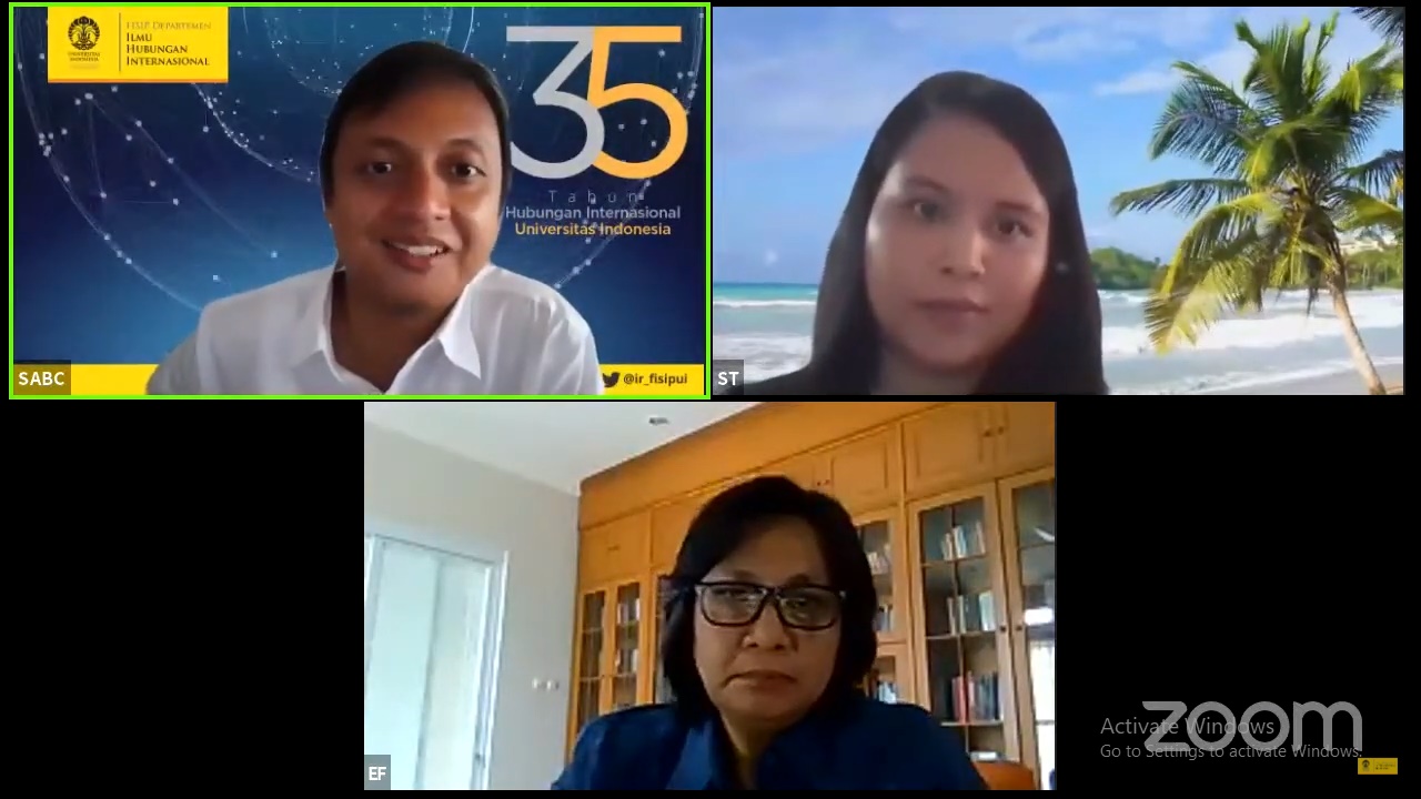 Departemen Hubungan Internasional FISIP UI mengadakan dialog daring bertajuk ”Defining Nurani #3: Representasi Human Security dalam Seni Kontemporer” pada Kamis (18/6). Sebagai pembicara, Sally Texania (Kurator Seni Independen dan Alumni S2 HI FISIP UI 2010), sebagai pembahas Evi Fitriani, PhD (Staf Pengajar Departemen Hubungan Internasional FISIP UI) dan sebagai moderator Shofwan Al Banna C, Ph.D (Staf pengajar Departemen Hubungan Internasional FISIP UI). Pada dialog daring ketiga ini Sally memaparkan element human security melalui seni rupa.